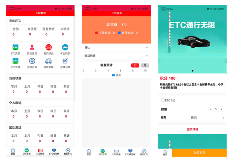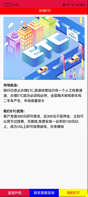 我们ETC优势:客户充值300元即可激活,这300元不是押金,立刻可以用于过路费,无套路,免费安装一台奖励100元以上,成为V以上即可自用省钱,分享赚钱
